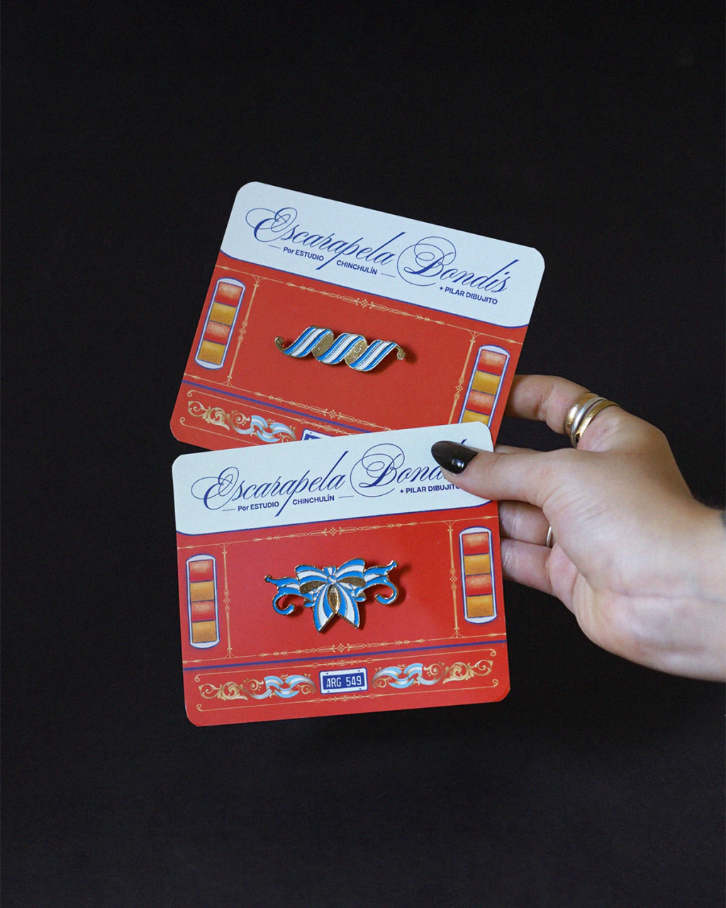 Miden 50 mm en su lado más largo, son robustos, tipo prendedor. Tienen terminación dorada, pintados a mano y con doble pin de silicona para no perderlo. Vienen en dos modelos: Ribete (el moño) y Filete (la cinta)