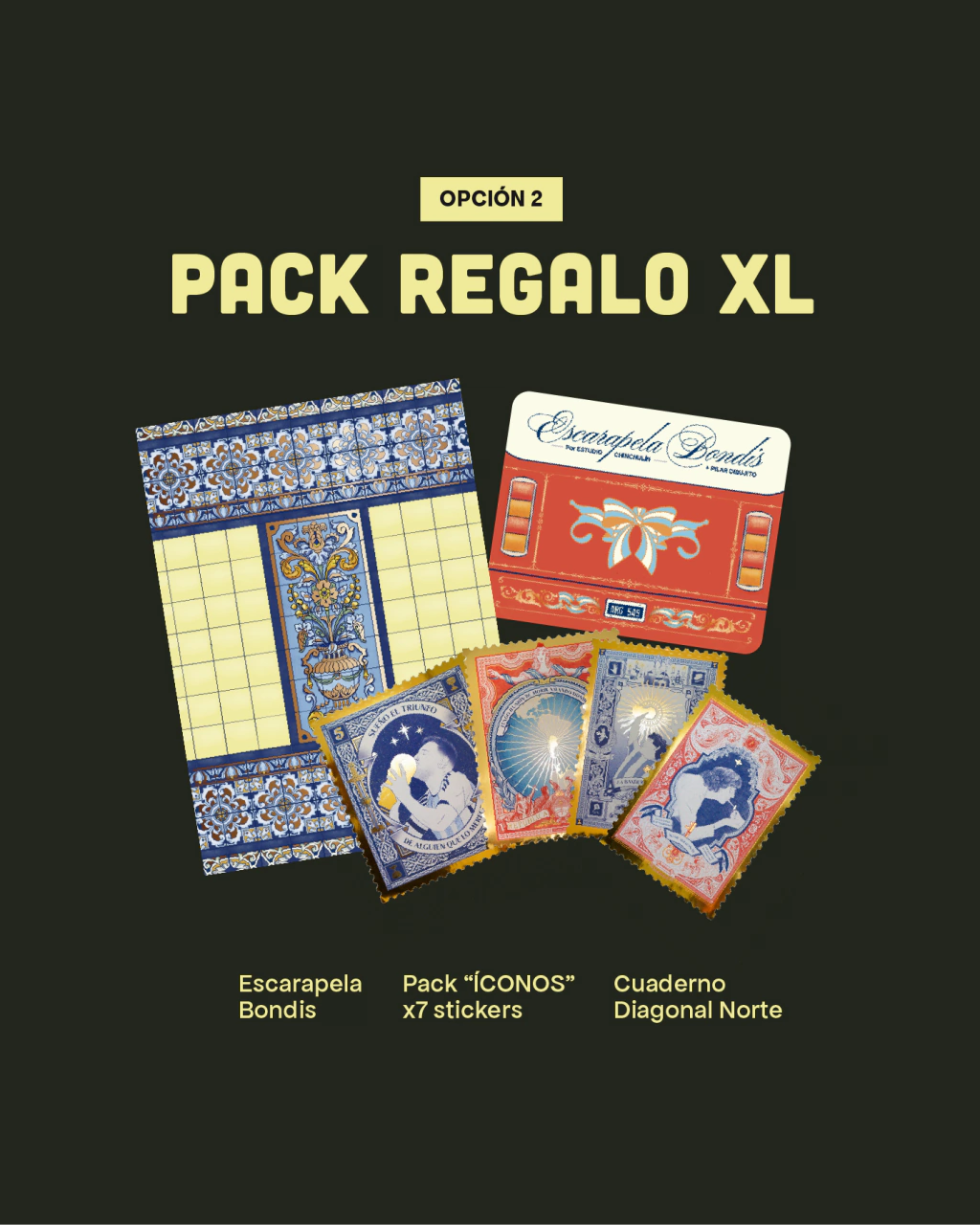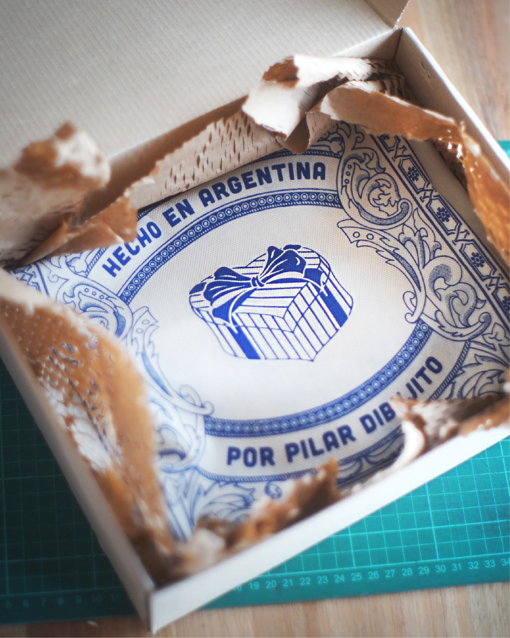 La escarapela y el pack de stickers vienen en un sobre liso, cerrado con un sticker + una postal de argentina c/u. El cuaderno viene en una bolsa estampada en serigrafía + una postal de argentina. Además, la caja incluye 3 u. de postales con foil dorado para dedicar tu regalo.